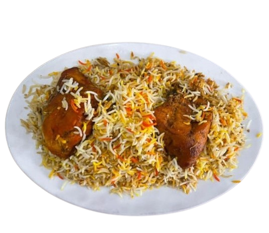 A Plate of Traditional Biryani with 2 steamed chicken pieces